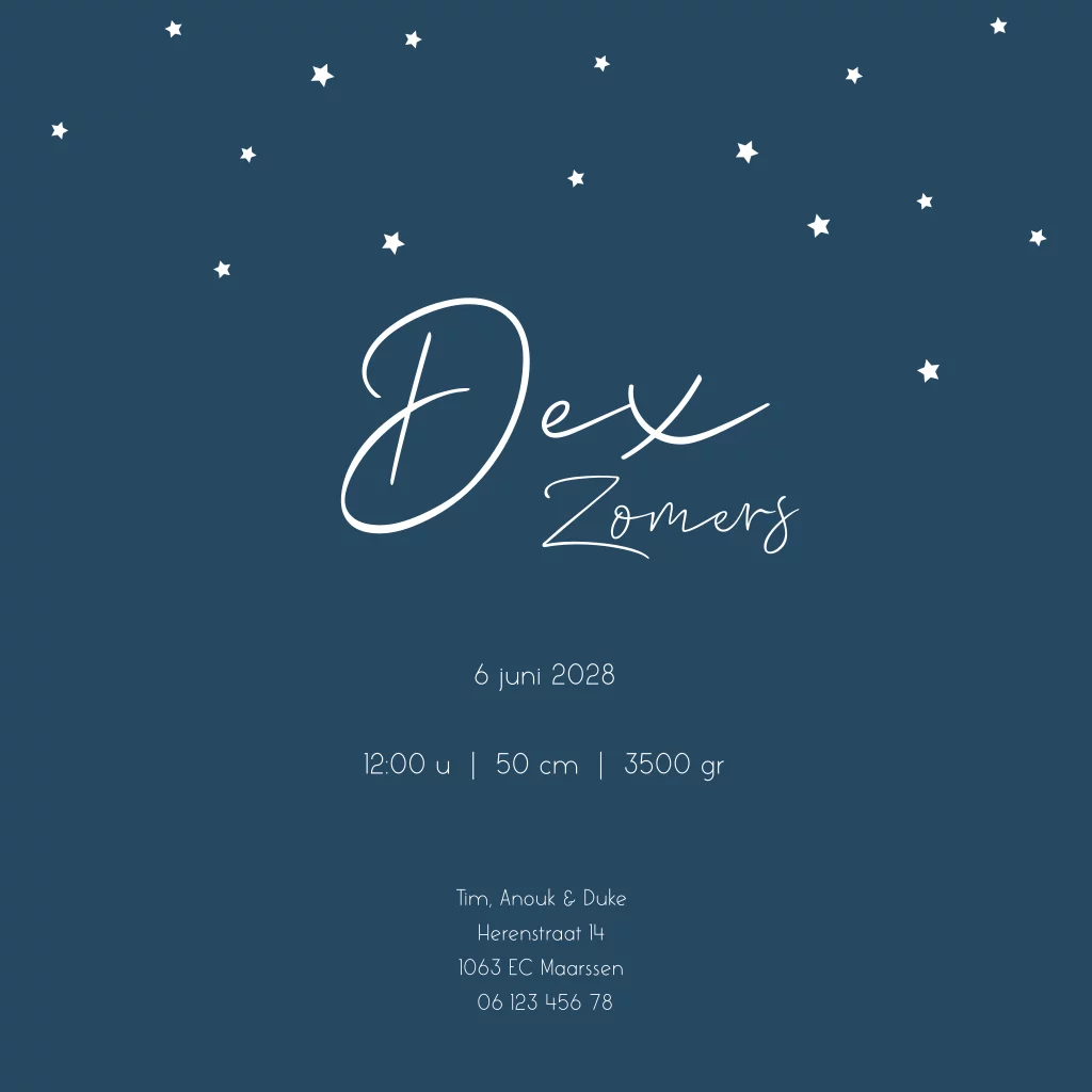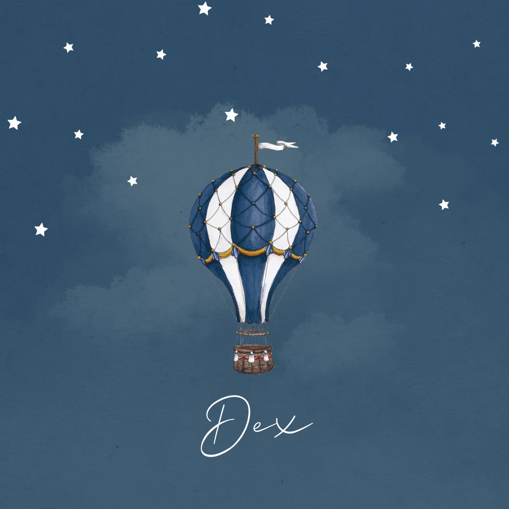 Dit is een stijlvol geboortekaartje voor je zoon. Het kaartje heeft een donkerblauwe watercolour achtergrond met de illustratie van een luchtballon. De kleine witte sterren maken dit kaartje helemaal compleet. Het kaartje kan naar wens aangepast worden in onze online editor.