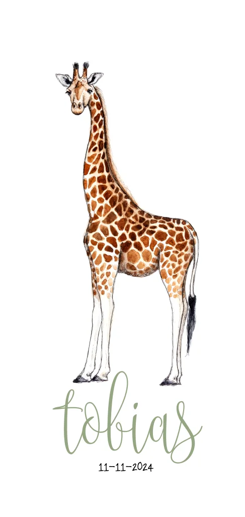 Stoere geboortekaart voor je zoon met een hippe tekening van een girafje op een witte achtergrond. Verander de kleuren, lettertypes en schrijf een persoonlijke boodschap en verstuur dit geboortekaartje!