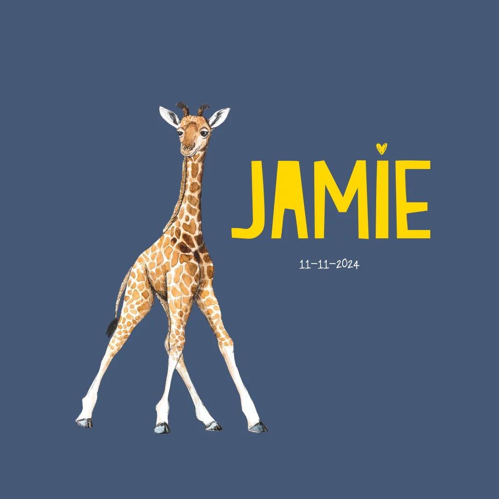 Stoer jongens geboortekaartje voor je zoon in jungle dieren thema. De schattige giraf baby op de voorkant is een prachtige illustratie van waterverf. De combinatie van geel tinten op donkerblauw maakt dit hippe geboortekaartje helemaal af!
