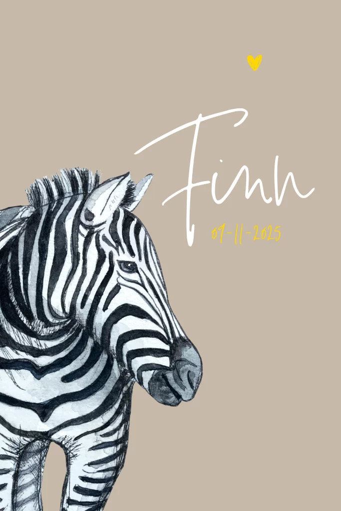 Stoere geboortekaart voor de geboorte van je zoontje met hippe handgetekende en aquarel geschilderde zebra op een taupe kleurige achtergrond. Liever een andere achtergrondkleur of lettertype? Maak dit geboortekaartje helemaal naar wens in de online editor!
