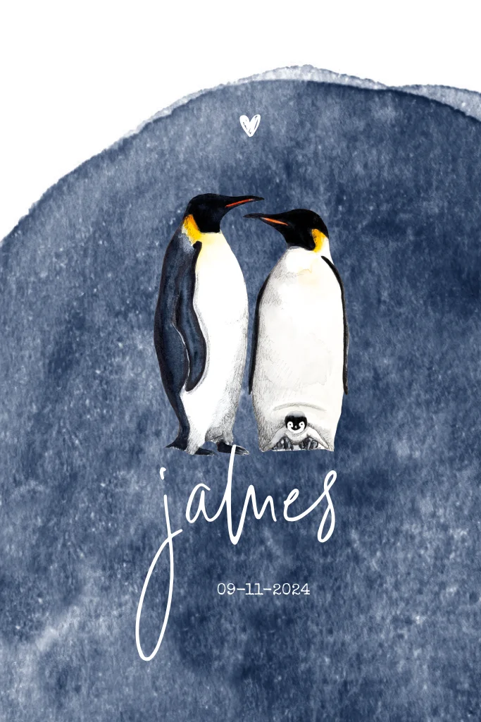 Stoere geboortekaart voor je zoontje met een mooie illustratie van een pinguïn familie met hun pasgeboren babytje. De achtergrond van donkerblauwe waterverf maakt dit geboortekaartje echt stoer!