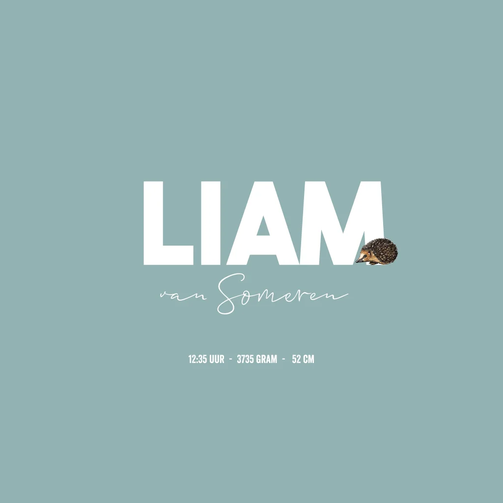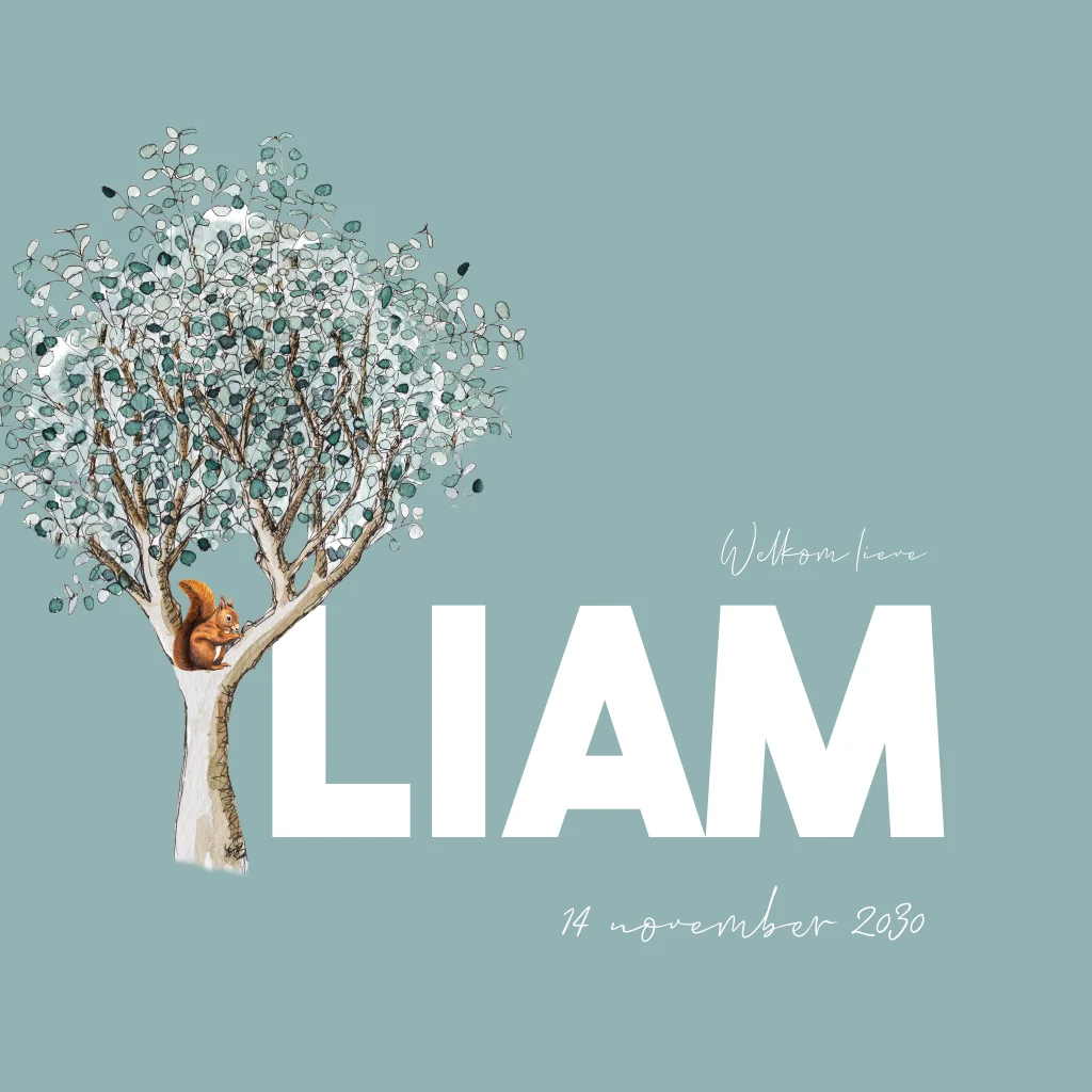 Een hip geboortekaartje voor jouw kindje. Het vierkante kaartje heeft een illustratie van een boom met vogeltje en eekhoorn. Pas het ontwerp naar wens aan in onze online editor.