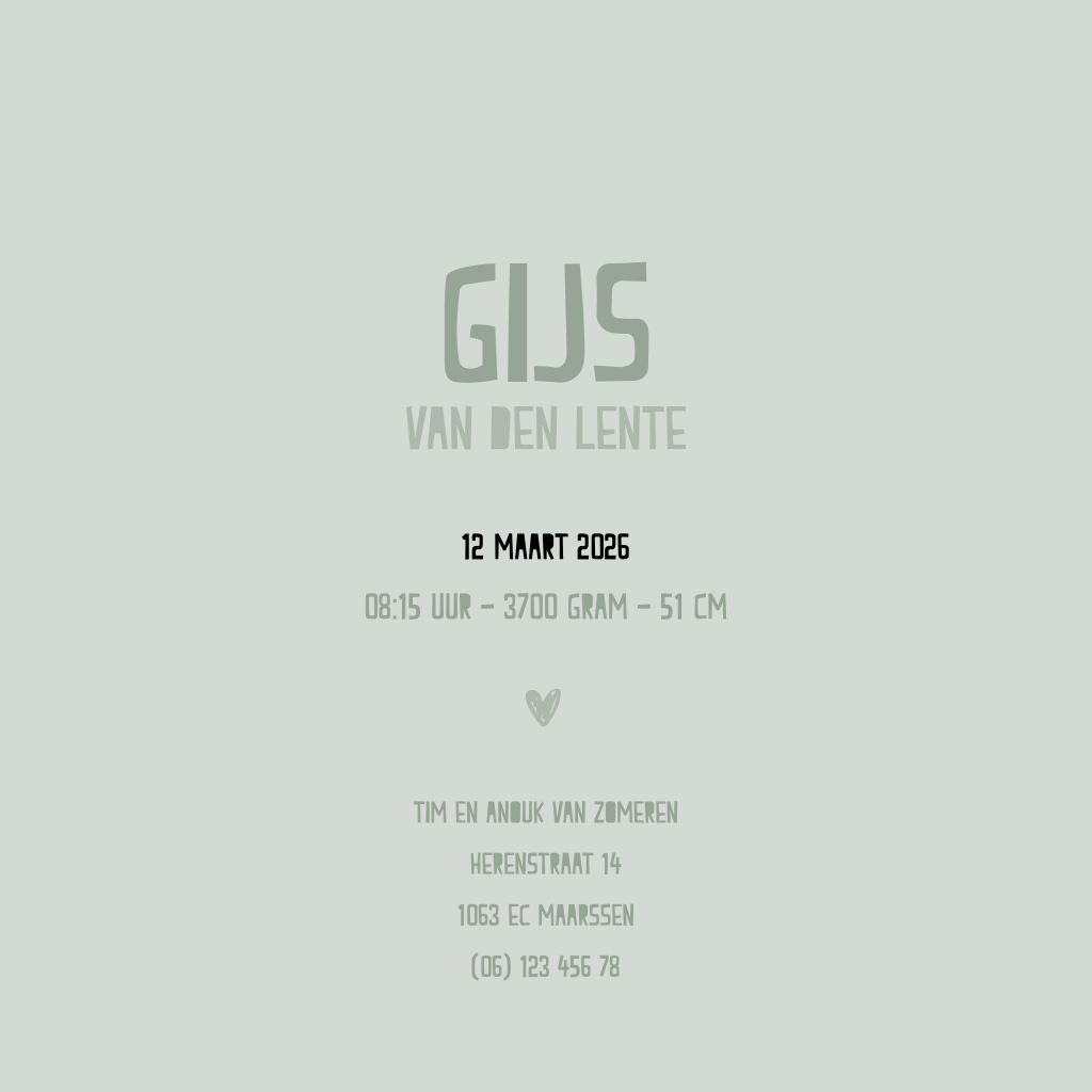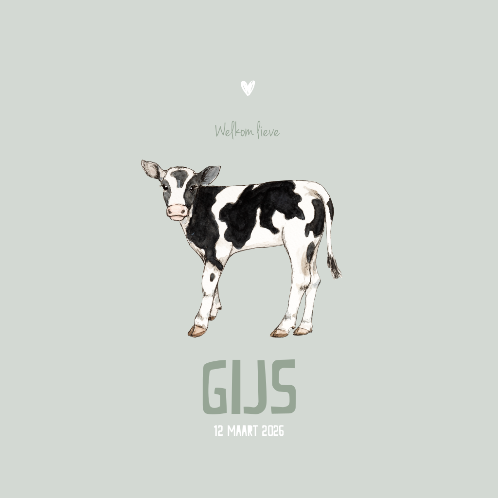 Dit is een lief geboortekaartje voor jullie zoon. Het kaartje heeft een groene achtergrond met de tekening van een kalfje. Het kleine hartje maakt dit kaartje helemaal af. Pas het kaartje naar wens aan in onze online editor en bestel een proefdruk om dit kaartje in het echt te zien!