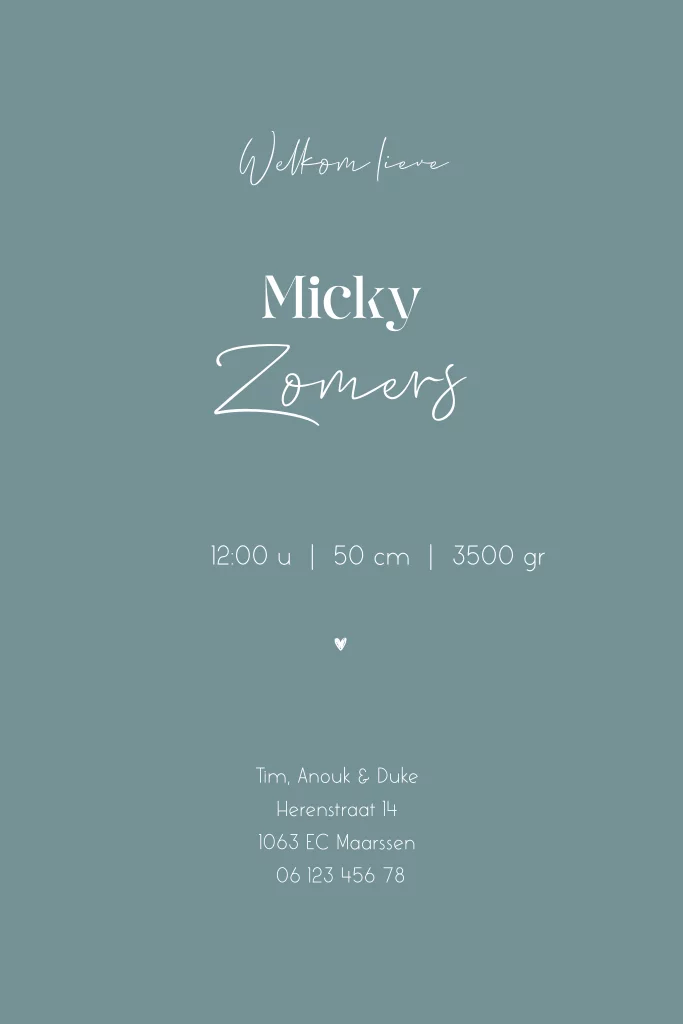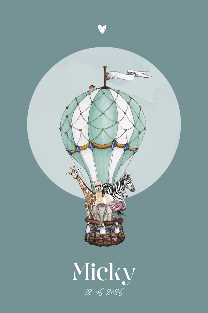 Staand hip geboortekaartje voor jouw kindje. Het kaartje heeft een petrol achtergrond kleur met daarop een toffe illustratie van de luchtballon vol met dieren, getekend door BINTJE. Dit kaartje is helemaal zelf aanpassen in de editor. Maak met andere kleuren, lettertypes of een ander diertje er je eigen geboortekaartje van.