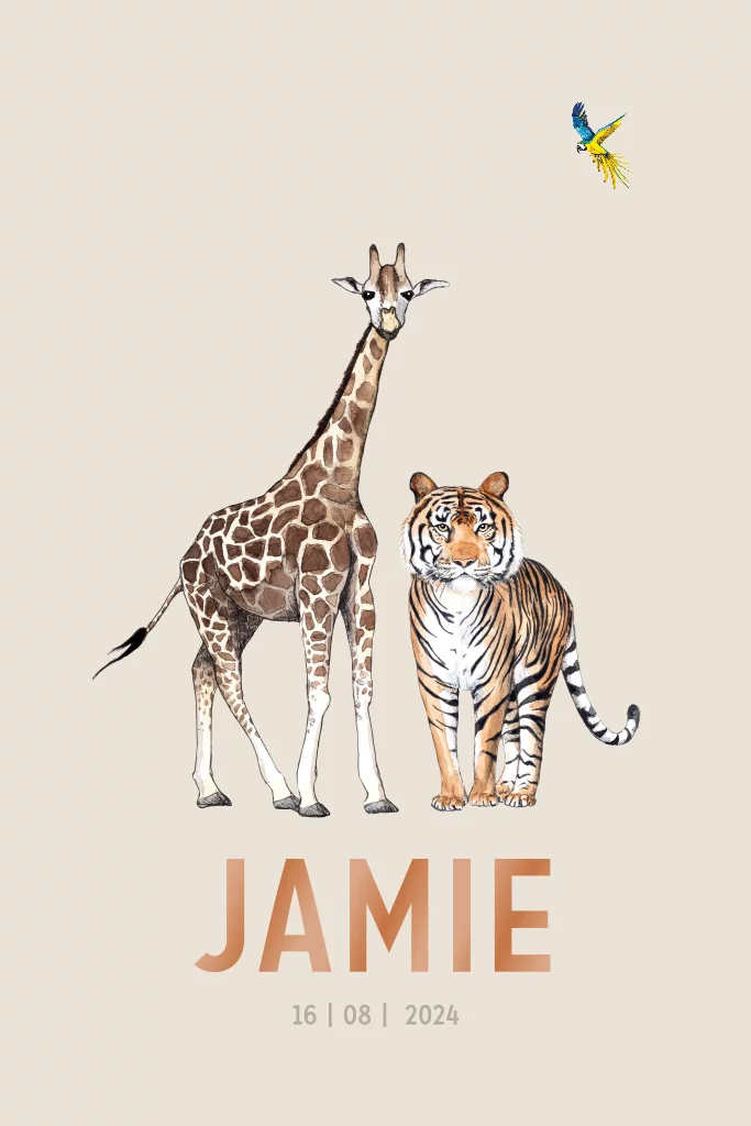 Een staand geboortekaartje met illustraties van de giraf en de tijger. Het kaartje heeft een beige achtergrond met hoogglans details. Dit kaartje is helemaal zelf aanpassen in de editor. Maak met andere kleuren, lettertypes of een ander diertje een uniek geboortekaartje.