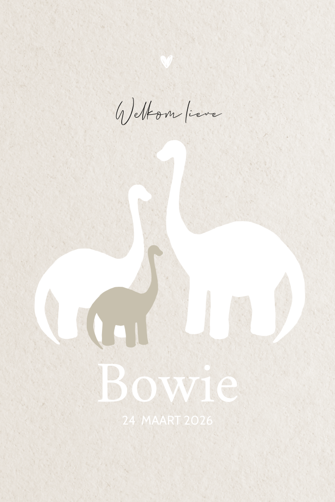 Een lief en trendy geboortekaartje met drie silhouetjes van dino's. Deze schattige illustraties zijn gemaakt door onze designer Bintje. De naam is gedrukt in goudfolie. Pas het kaartje naar wens aan in onze online editor.