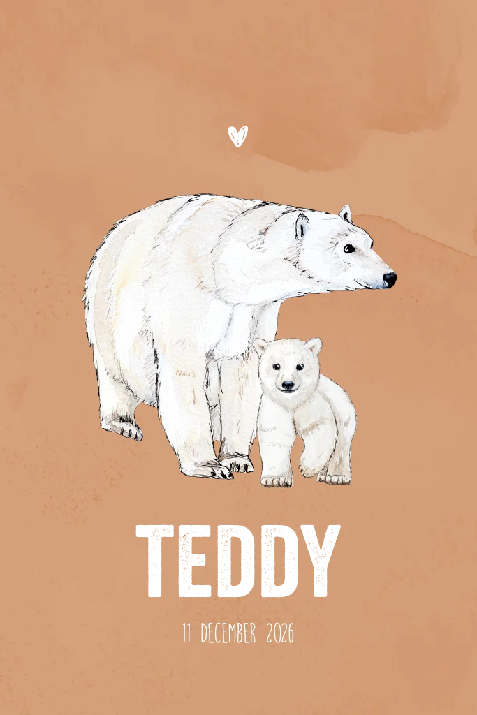 Een hip unisex geboortekaartje voor jullie toekomstige kleintje. Op het kaartje zie je een illustratie van twee ijsberen. Het kaartje heeft een warme kleur en watercolour achtergrond. De naam is gedrukt in goudfolie. Pas dit kaartje naar wens aan in onze online editor.