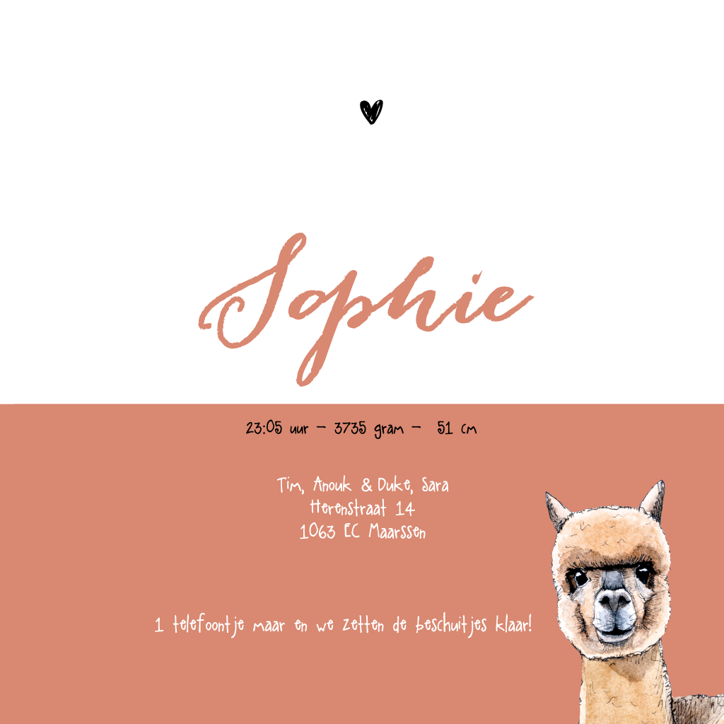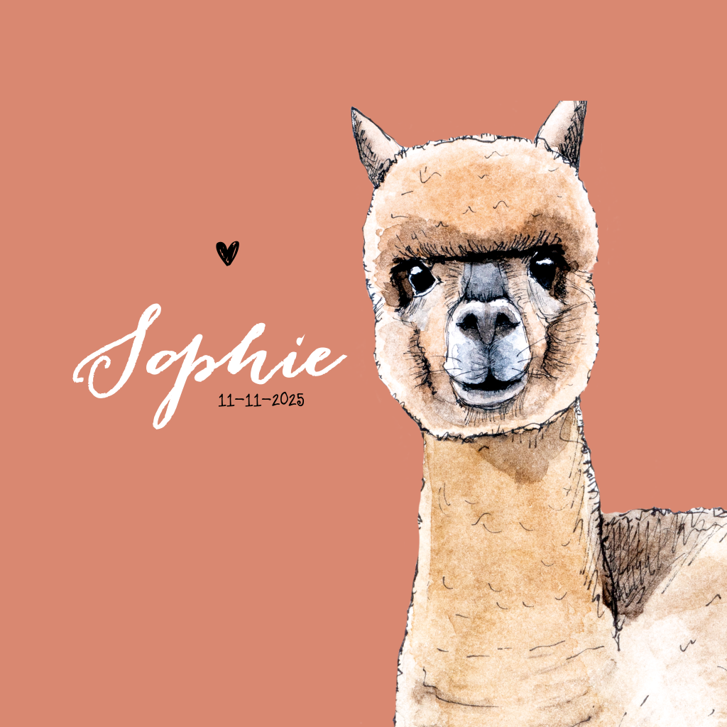 Trendy geboortekaartje voor meisje met hippe alpaca tekening