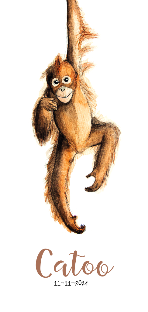 Hip geboortekaartje voor meisje met watercolour tekening van aapje