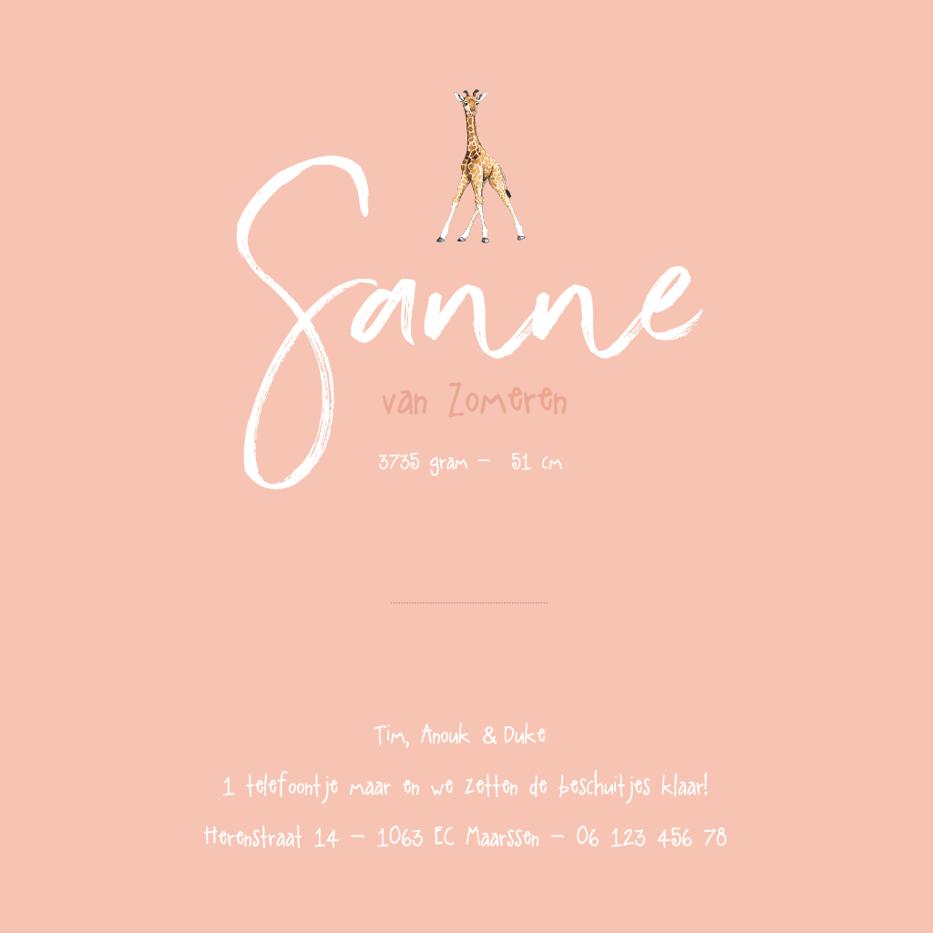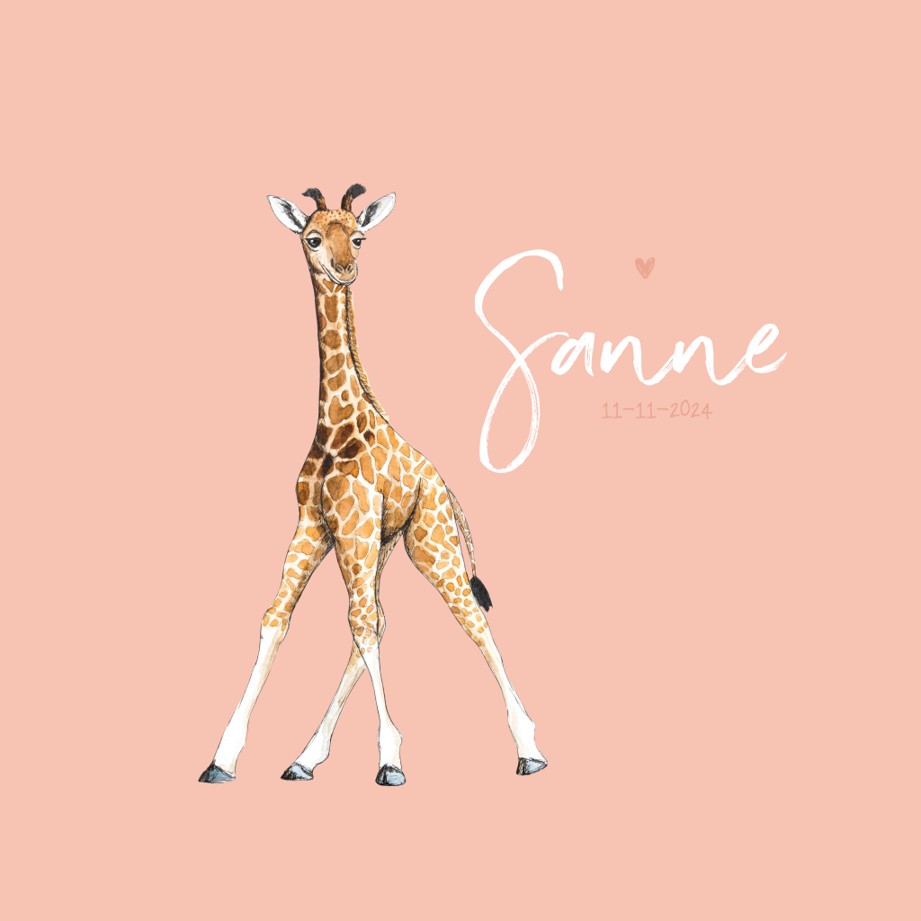 Vrolijk en schattig geboortekaartje voor meisje met lieve tekening van een baby giraffe op een zachte peach achtergrond.