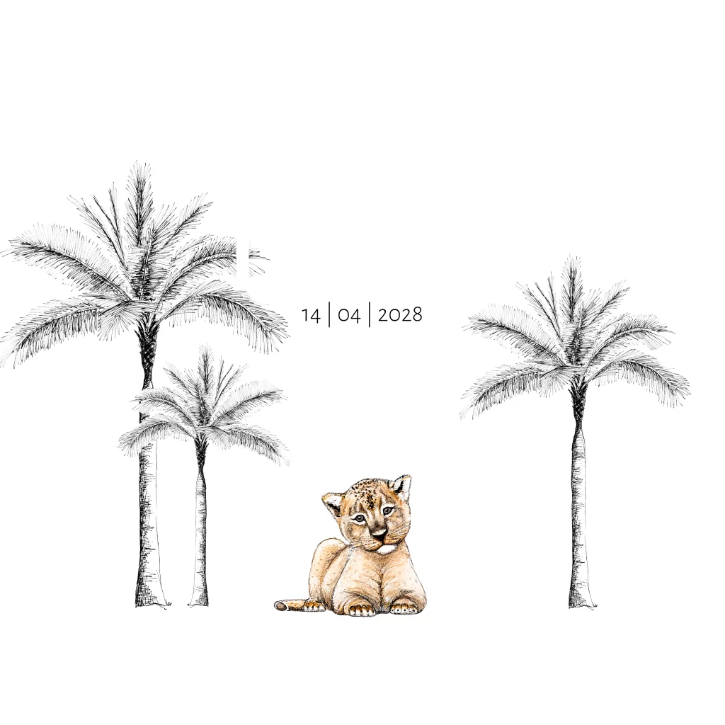 Stoer geboortekaartje met goudfolie, leeuw en palmbomen