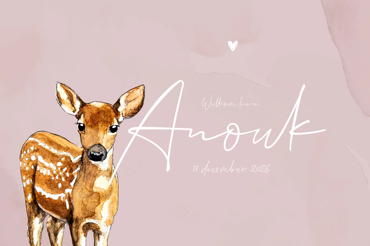 Een geboortekaartje met een lieve illustratie van een hertje. De achtergrond van het kaartje bestaat uit roze watercolour. De naam op het geboortekaartje is gedrukt in roségoudfolie. In onze editor kan je dit kaartje volledig naar wens aanpassen.