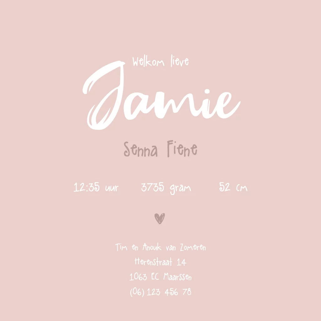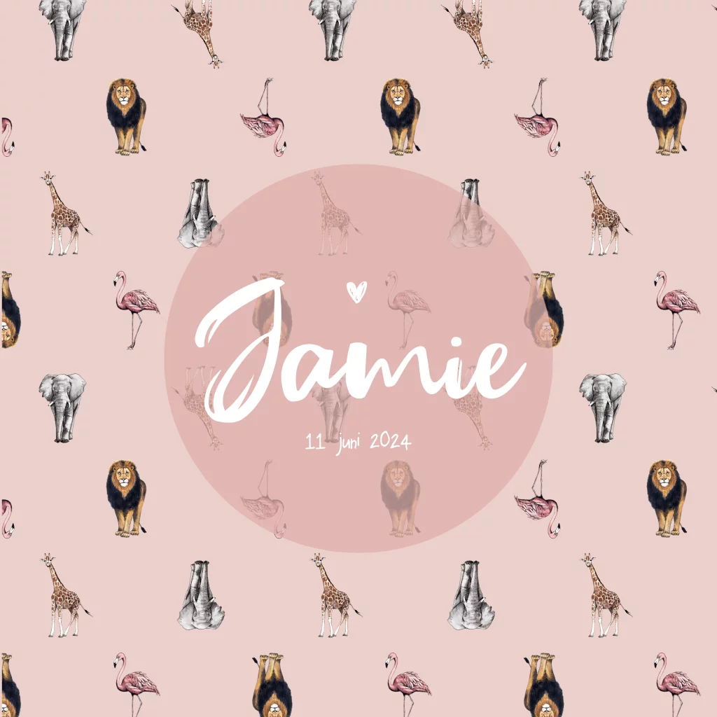 Dit is een stoer geboortekaartje voor jullie dochter. Het kaartje heeft een roze achtergrond met de kleine illustraties van flamingo's, olifanten en leeuwen. Pas het kaartje naar wens aan in onze online editor en bestel snel een proefdruk om dit kaartje in het echt te zien!