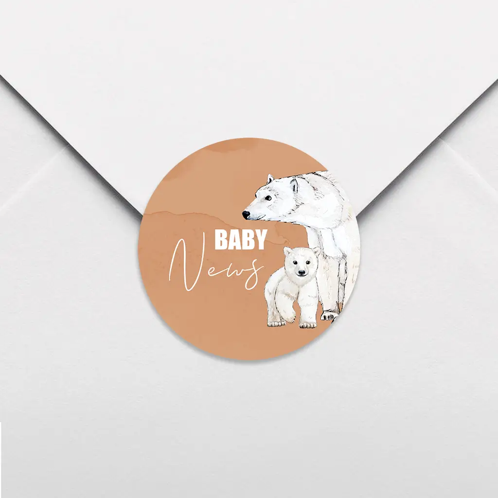 Sluitsticker roestkleur met ijsberen en tekst 'Baby news' - per 25 stuks