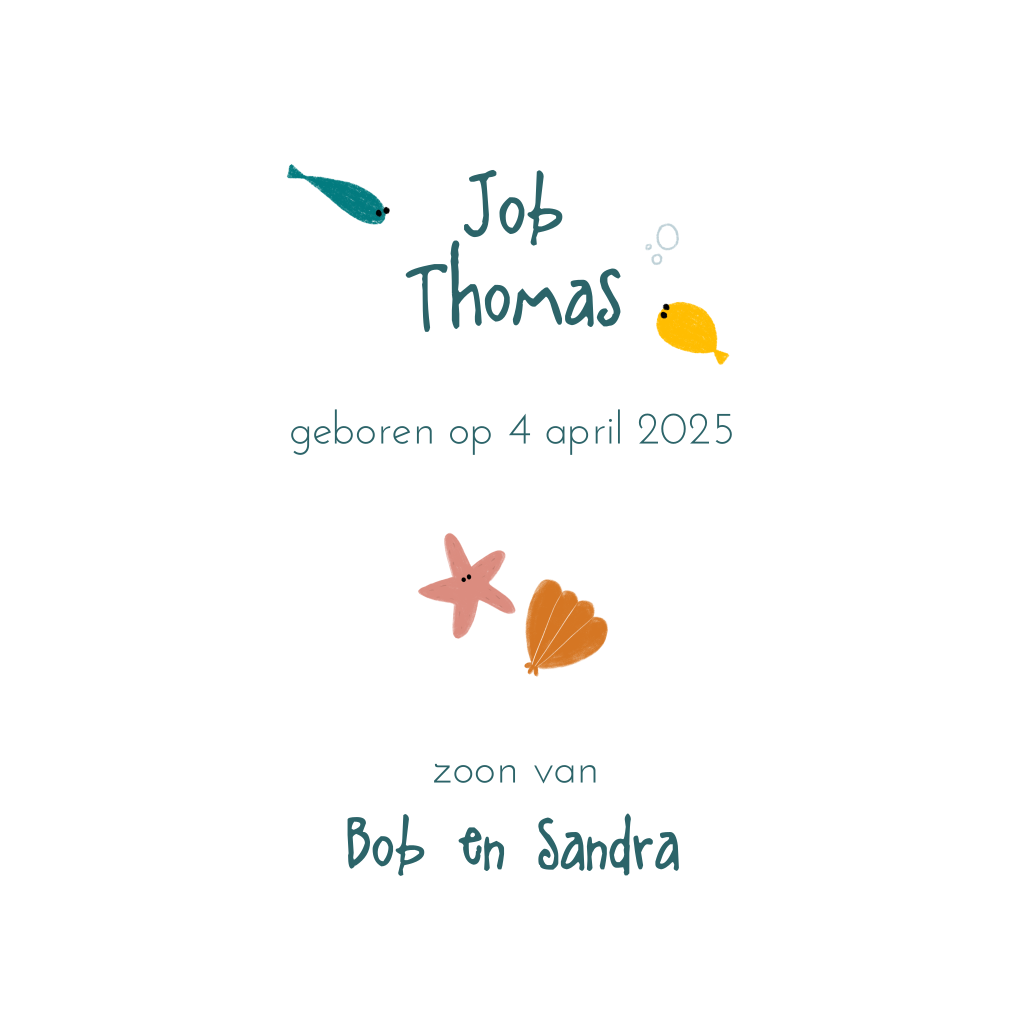 Vrolijke geboortekaart voor de geboorte van je zoon met kleurrijke illustratie van een krab die een feestje viert met andere waterdieren zoals visjes en zeewier.