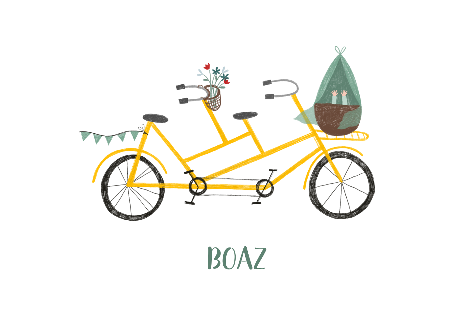 Origineel geboortekaartje voor een jongen of meisje met een hippe illustratie van een okergele tandem fiets met een groen wiegje met daarin een baby. Kies papiersoort Oud-Hollands en combineer met een mooie gekleurde envelop!
