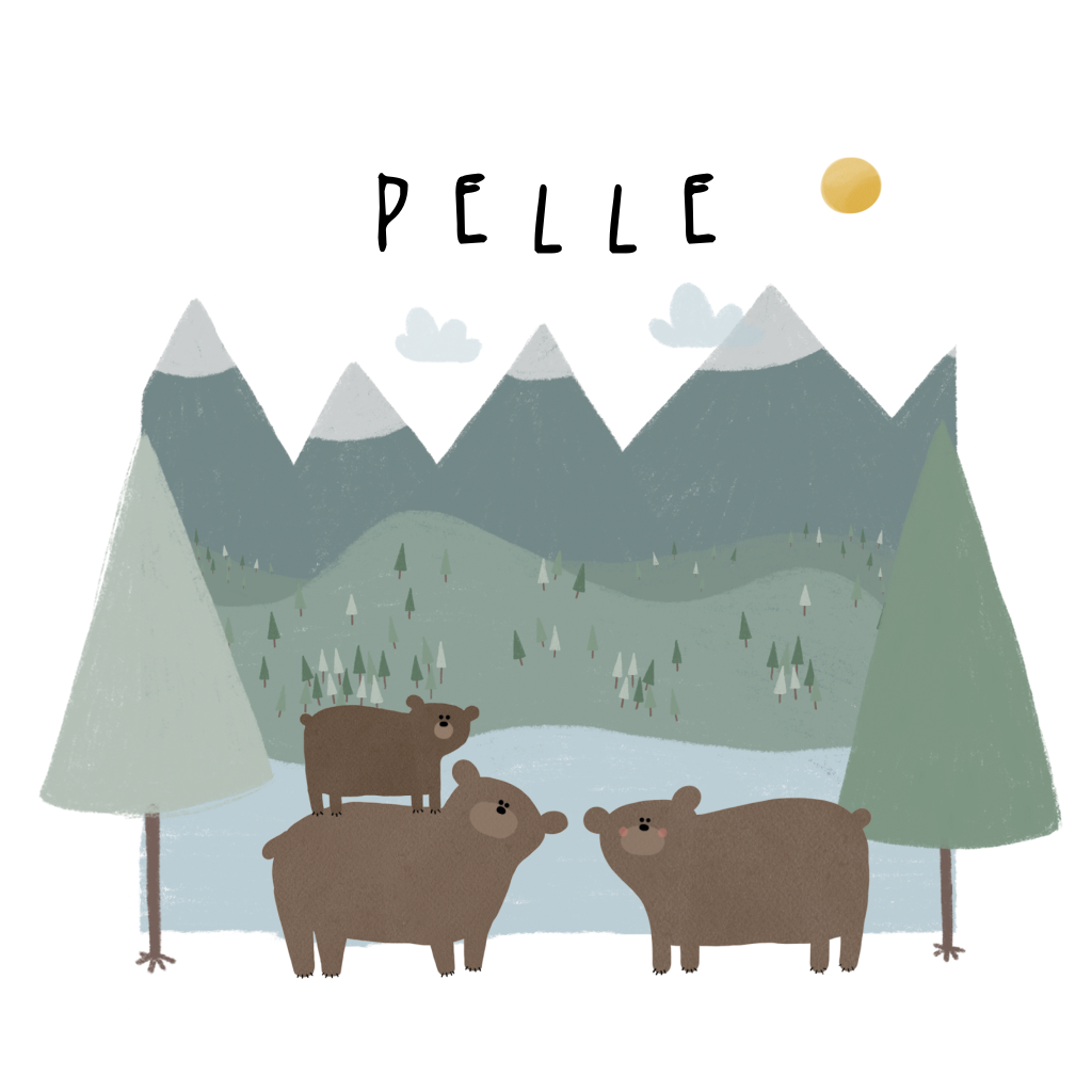 Hip geboortekaartje voor de geboorte van je zoon met stoere illustratie van beertjes in het bos bij een meertje. De bergen op de achtergrond maken dit avontuurlijk geboortekaartje helemaal af!