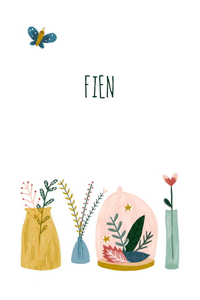 Een vrolijke vlinder vladdert boven prachtige, kleurrijke vazen met takjes! Dit hippe geboortekaartje is leuk voor een meisje. Tip: kies een envelop in een van de kleuren van de voorkant.
