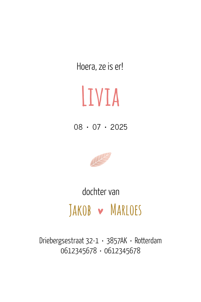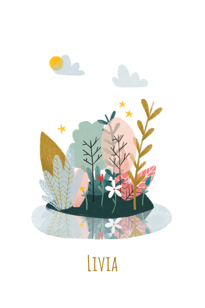 Vrolijk geboortekaartje voor je dochtertje met een hippe en kleurrijke illustratie van een eilandje met bomen, takjes en bloemetjes.