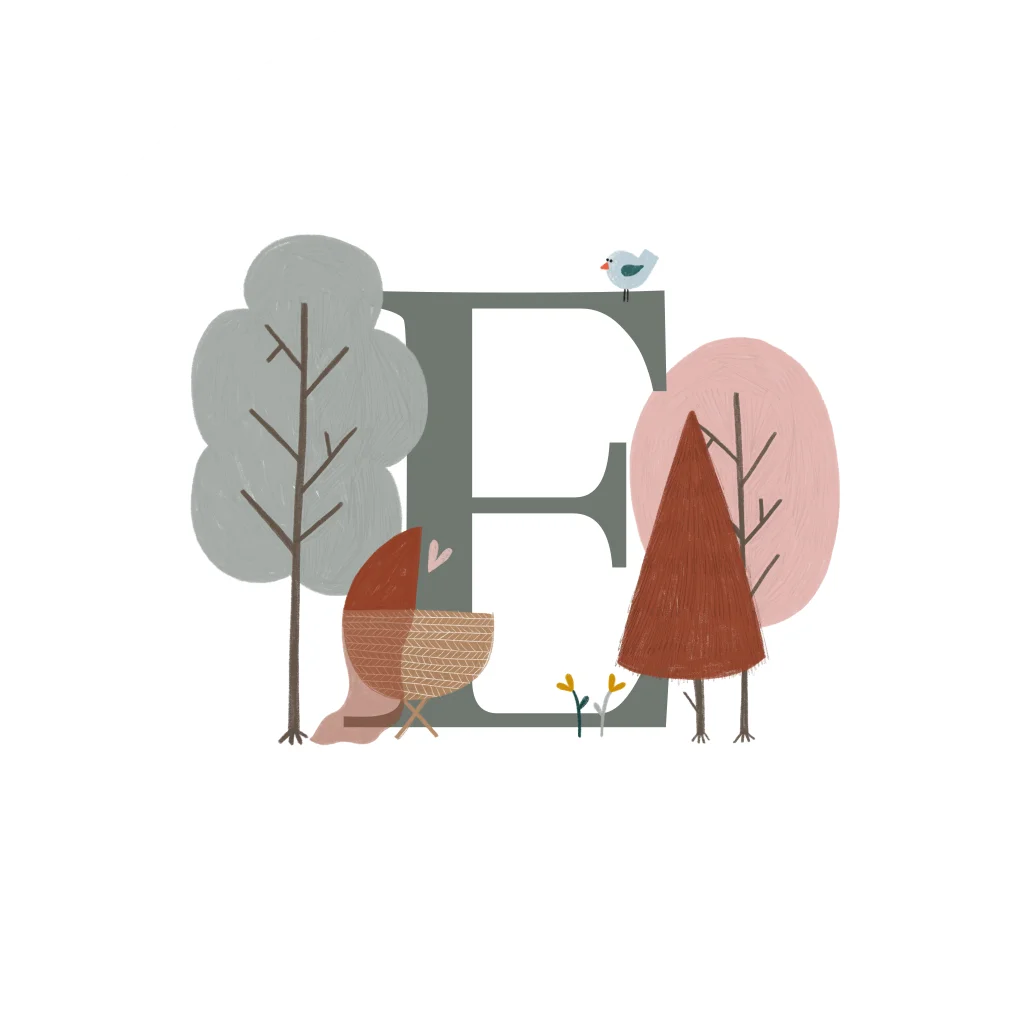 Sluitsticker met initiaal in het bos met een wiegje