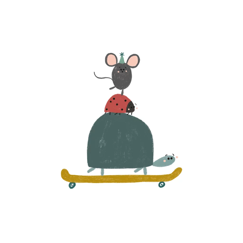 Een vrolijke sluitsticker met dieren boven op elkaar die rollen op een skateboard! Een muisje, lieveheersbeestje en schildpad hebben het grooste plezier. De sluitsticker past bij het originele geboortekaartje van Bladergoud.