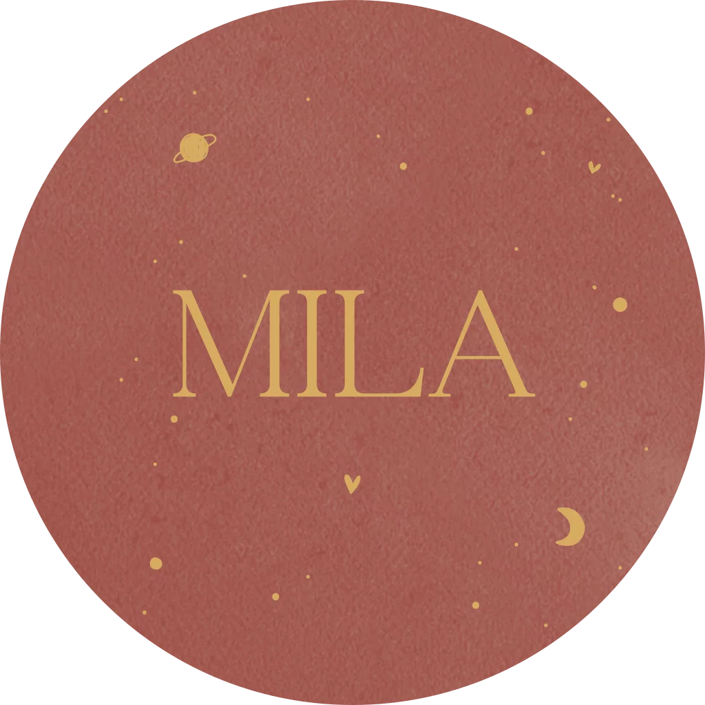 Stoere sluitsticker met de naam van je dochtertje in het midden. Op de sluitsticker staat heelal met een maantje, planeet en sterretjes op een rode watercolour achtergrond.