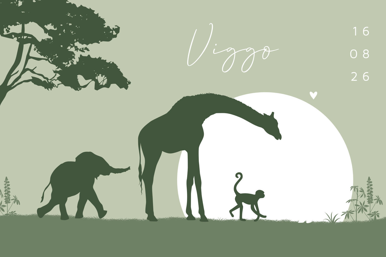 Dit is een stoer geboortekaartje met jungle thema voor jullie zoon. Op het kaartje staan de silhouetten van een boom, olifant, giraffe en aap. Ook is een silhouet van een jongetje te zien. Deze wordt gedrukt in goudfolie en valt daardoor extra op. Het kaartje kan gepersonaliseerd worden in onze online editor.