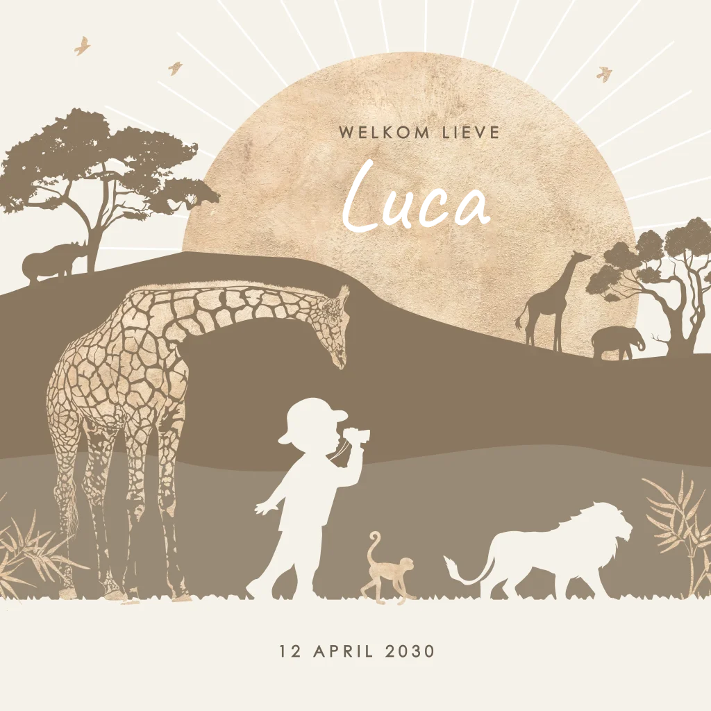 Een stijlvol en hip vierkant geboortekaartje met beige/bruine tinten voor jouw zoontje. Op het kaartje zie je een silhouetje tussen verschillende jungledieren. In de verte zie je de zon en verschillende bomen. Pas het kaartje naar wens aan in onze online editor.