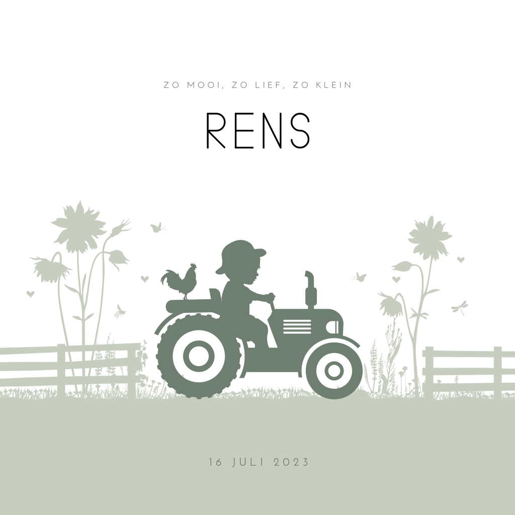 Een avontuurlijke babykaart voor jullie zoontje. Op dit ontwerp is een jongetje te zien dat op een trekker zit. Hij bevindt zich op een boerderij. De silhouetjes maken dit duidelijk. Alles is gekleurd in verschillende groentinten.