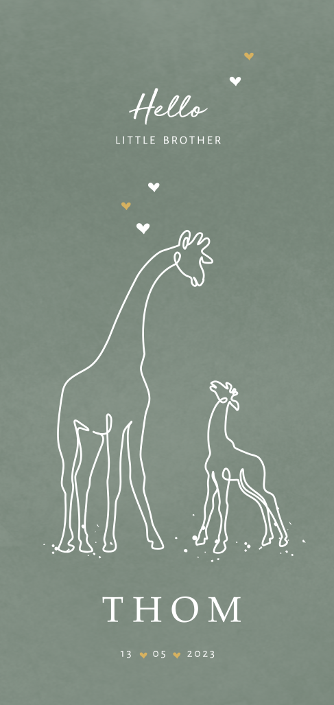 Dit langwerpige kaartje in het groen is zo lief vanwege de twee girafjes die erop te zien zijn. Deze twee moeten een moeder en haar zoontje voorstellen. Ook zijn er wat hartjes te zien, wat de kaart nog schattiger maakt.