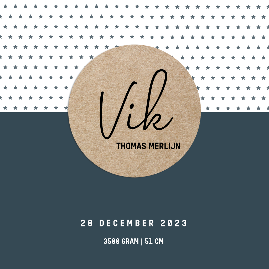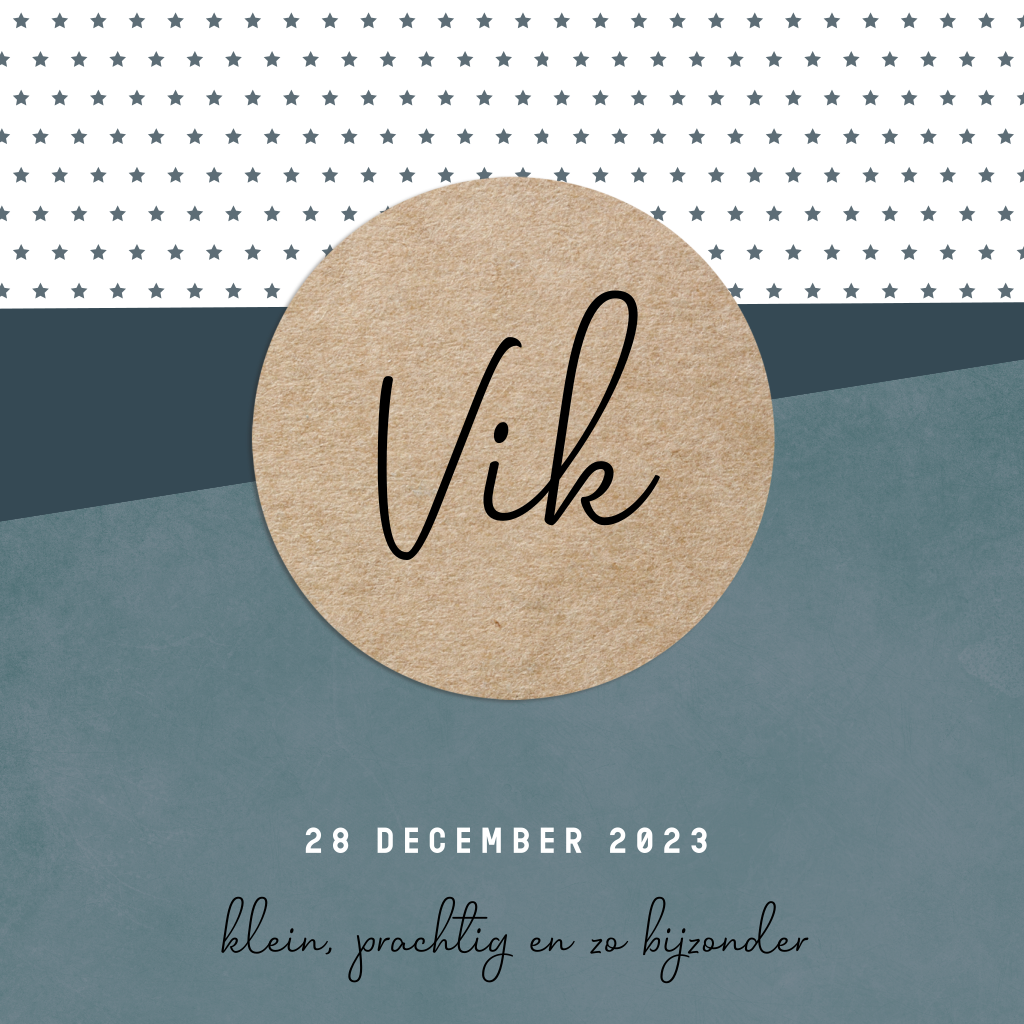 Wat een stoere kaart voor de geboorte van jullie kleine zoontje. Er zijn op dit exemplaar verschillende patronen te zien. Zo is er een wit achtergrondje met zwarte sterretjes, en twee tinten blauw in verschillende vlakken. In het midden is een rondje te zien met een kraftlook. Hierin staat de naam van jullie kleintje.