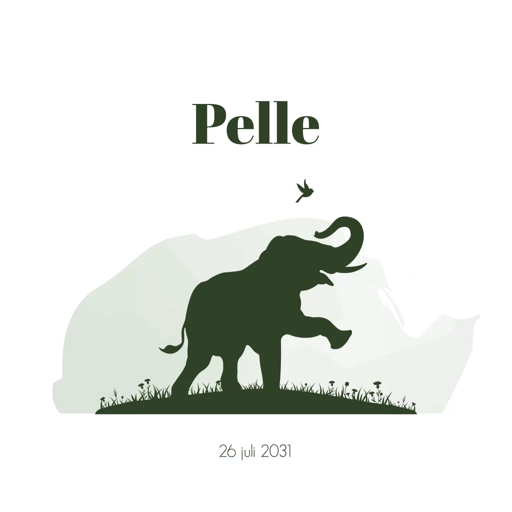 Stoer geboortekaartje voor jouw zoontje. Het kaartje heeft een witte basis met daarop een silhouet van olifantje. De achtergrond heeft een groen watercolour vlak.