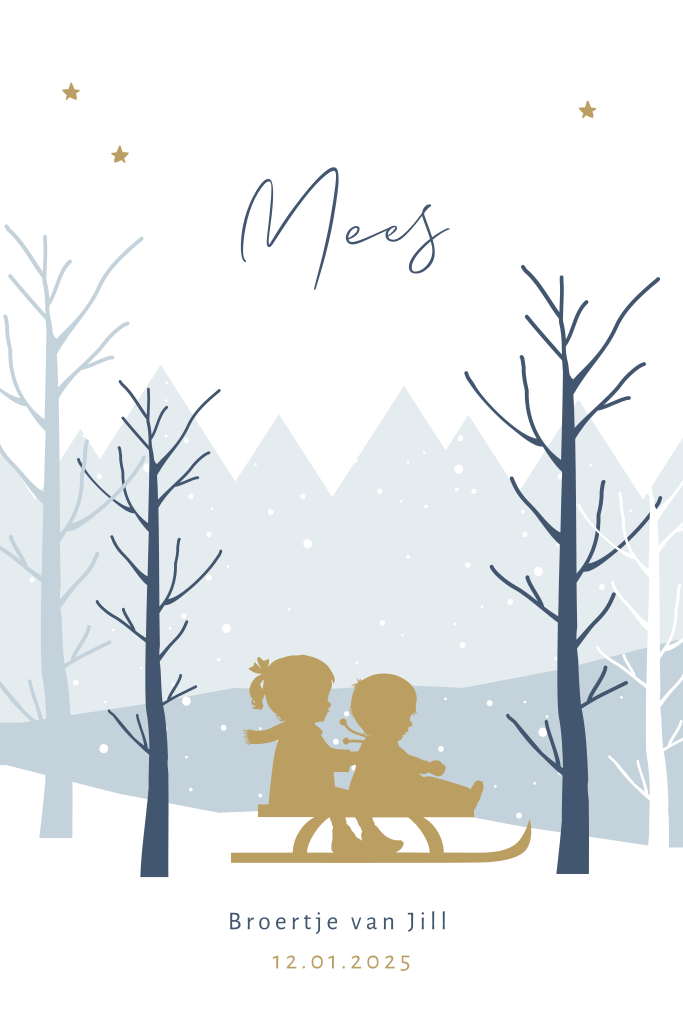 Kondig de geboorte van jullie zoon en broertje aan met dit winterse kaartje. Een grote zus met haar kleine broertje zijn aan het sleeën door een abstract landschap. Pas het kaartje naar wens aan in onze online editor en bestel snel een proefdruk om dit kaartje in het echt te zien!