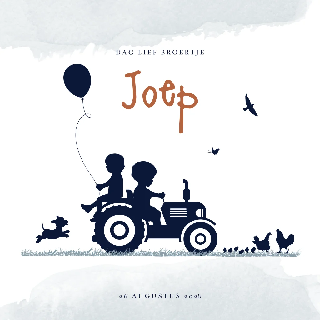 Stoere geboortekaart voor de geboorte van je tweede zoontje in boerderij thema. Met hip silhouet van twee broertjes die samen op de traktor zitten.