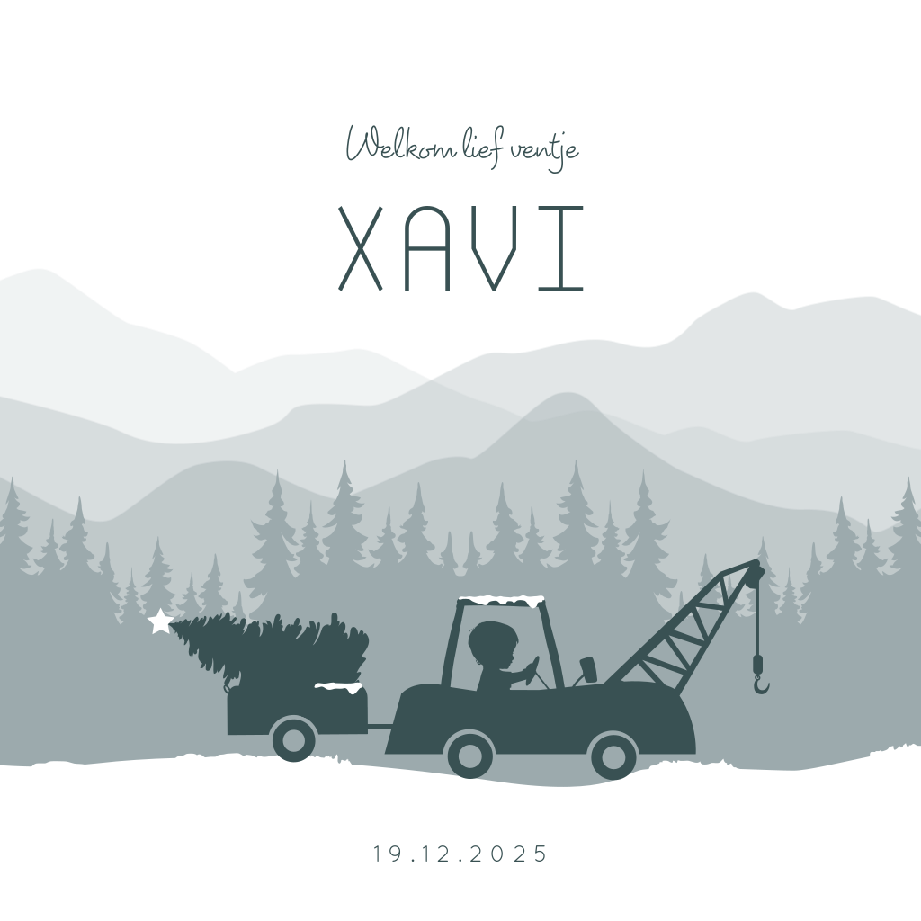 Dit is een winters kaartje voor jullie pasgeboren zoontje. In een abstract landschap rijdt een jongen in een takelwagen. De sneeuw op het dak is een leuk detail. Pas het kaartje naar wens aan in onze online editor en bestel snel een proefdruk om dit kaartje in het echt te zien!