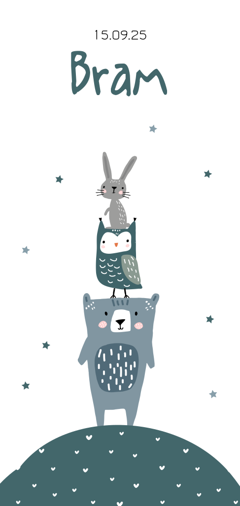 Schattig geboortekaartje met lieve illustratie van een beer, konijn en een uiltje die op elkaar staan gestapeld. De hartjes en sterretjes maken dit geboortekaartje helemaal af!