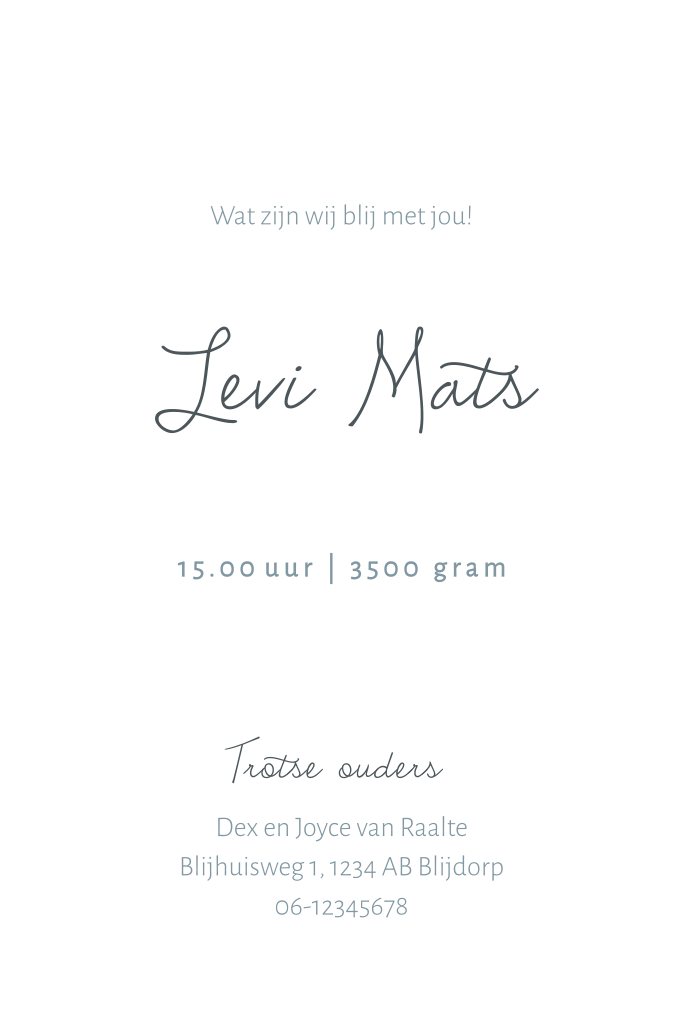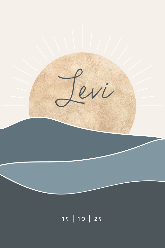Een prachtig geboortekaartje voor de geboorte van jullie zoon. Het kaartje geeft in minimalistische organische vormen het beeld van de zon en de zee. Deze vormen geven het kaartje een strak en moderne uitstraling. Pas de naam van jullie kleintje gemakkelijk aan in onze editor. Bestel een proefdrukje en bekijk thuis hoe het kaartje eruit komt te zien!