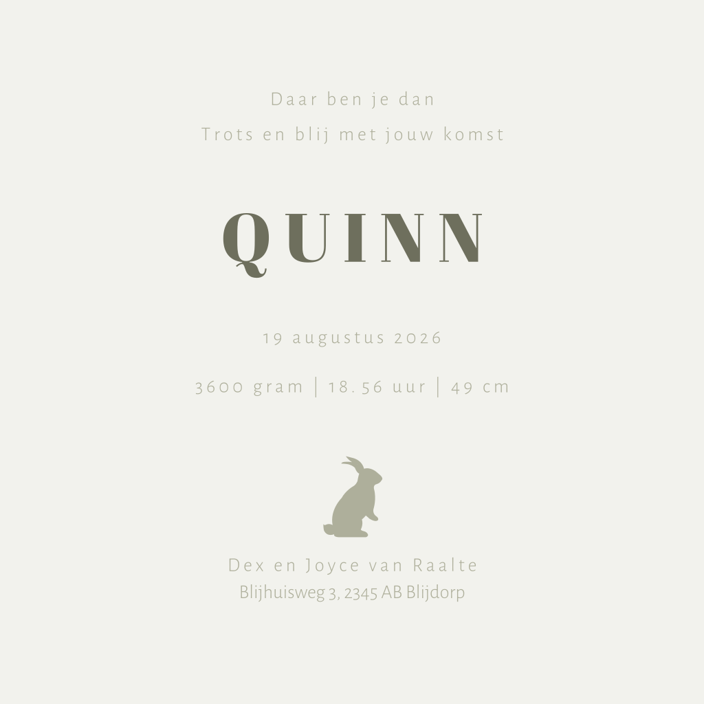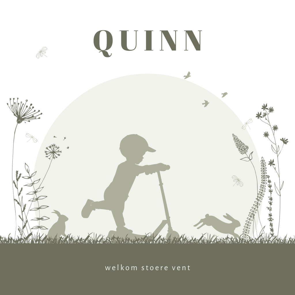 Kondig de geboorte van jullie zoontje aan met deze stoere kaart. Centraal op het kaartje staat het silhouet van een jongen die aan het steppen is door de natuur. De groentinten geven dit kaartje een neutrale uitstraling. Pas het kaartje naar wens aan in onze online editor en bestel snel een proefdruk om dit kaartje in het echt te zien!