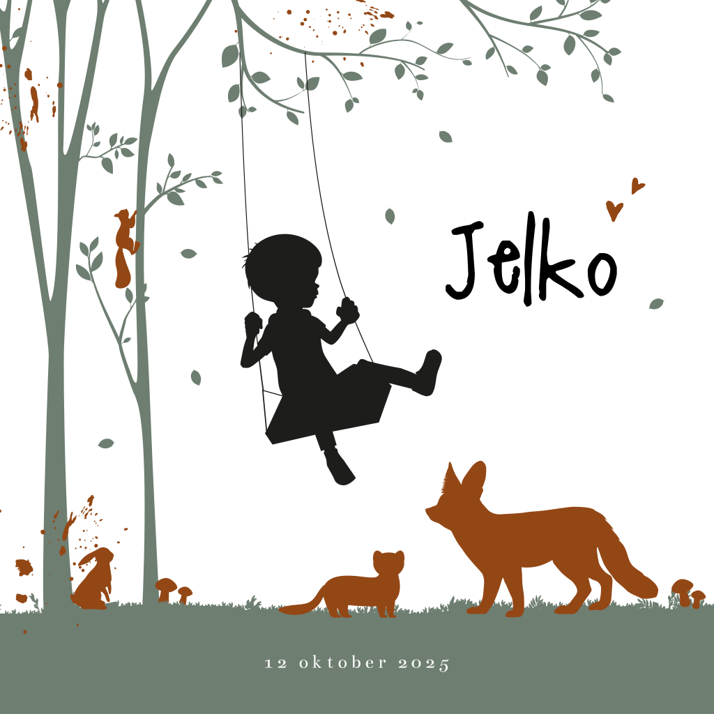 Hippe geboortekaart voor je zoontje met een silhouet van een jongetje op de schommel in het bos met allemaal bosdieren zoals een vos, konijn en eekhoorn.