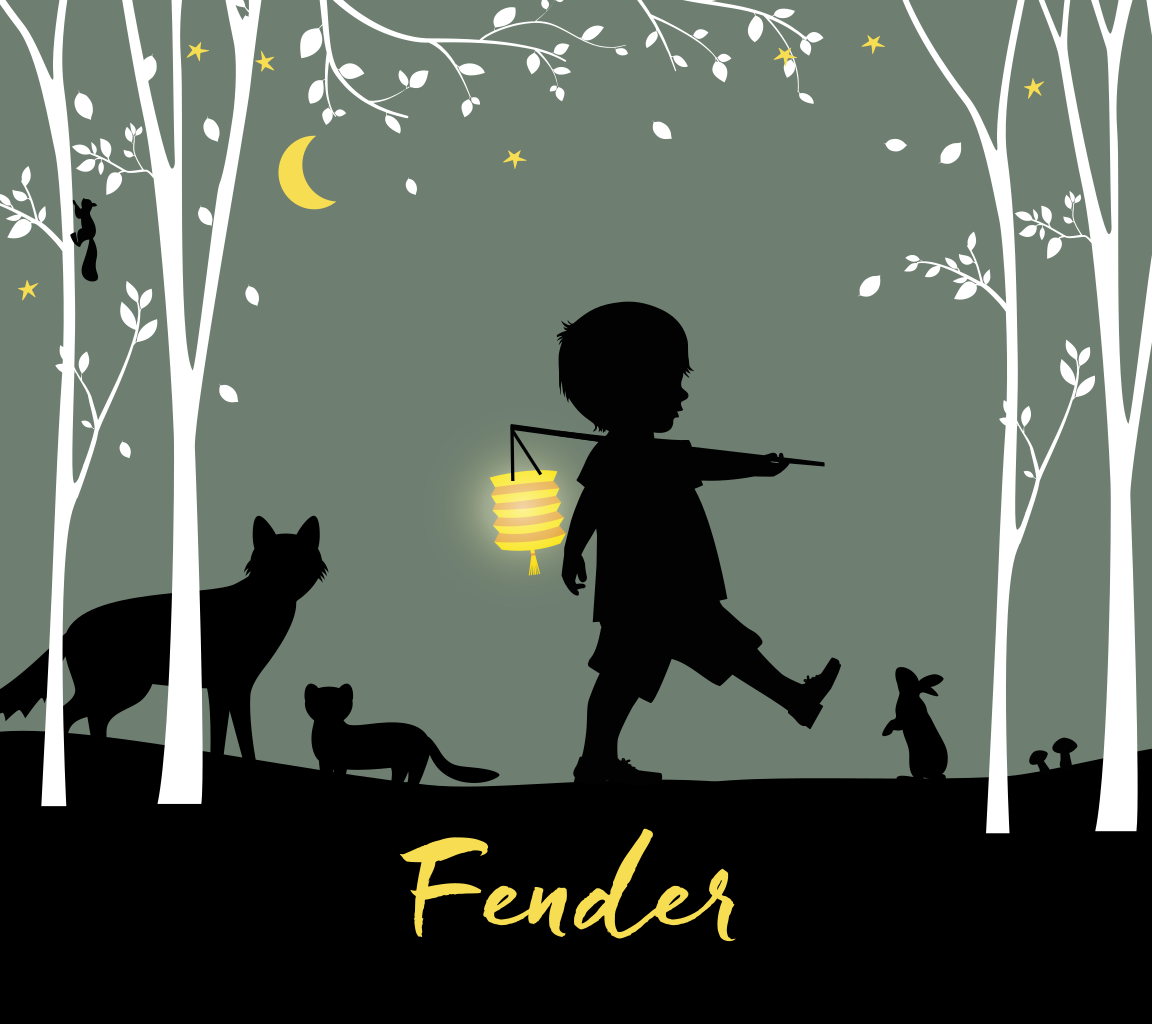 Trendy geboortekaartje voor je zoontje met een silhouet van een jongetje met zijn lampion in het bos. De maan en sterren staan al aan de hemel en de bosdieren komen te voorschijn.