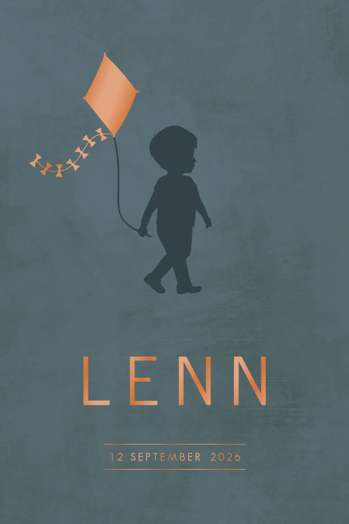 Een vrolijk geboortekaartje voor de geboorte van jullie zoon. Het kaartje heeft een grijs-blauwe achtergrond met een silhouetje van een jongetje die een vlieger vasthoudt. De vlieger en de naam van jullie zoontje wordt in prachtig hoogglans gedrukt wat een luxe uitstraling geeft. De ronde hoeken maken het kaartje helemaal compleet.