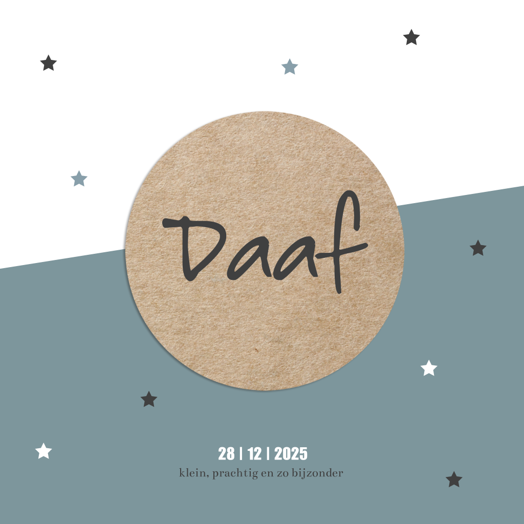 Stoer en trendy geboortekaartje in wit en groen, met vrolijke sterretjes en een rond naamlabel. Leuk voor een zoon! Maak hem zelf af met eigen teksten in de lettertypes naar wens.