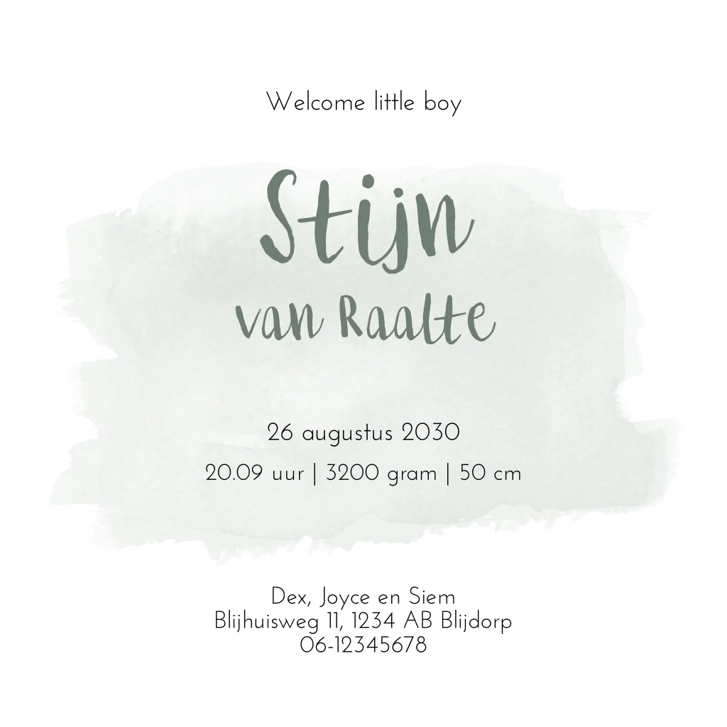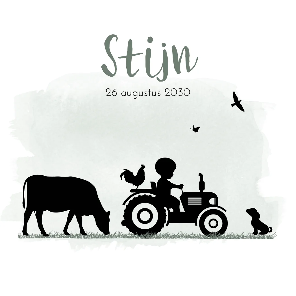 Stoere geboortekaart voor je zoon met een hip silhouet van een jongetje die op de traktor zit tussen de boerderij dieren zoals een haan, een koe en een hond. Verander de kleur van het waterverf op de achtergrond en maak een uniek geboortekaartje!