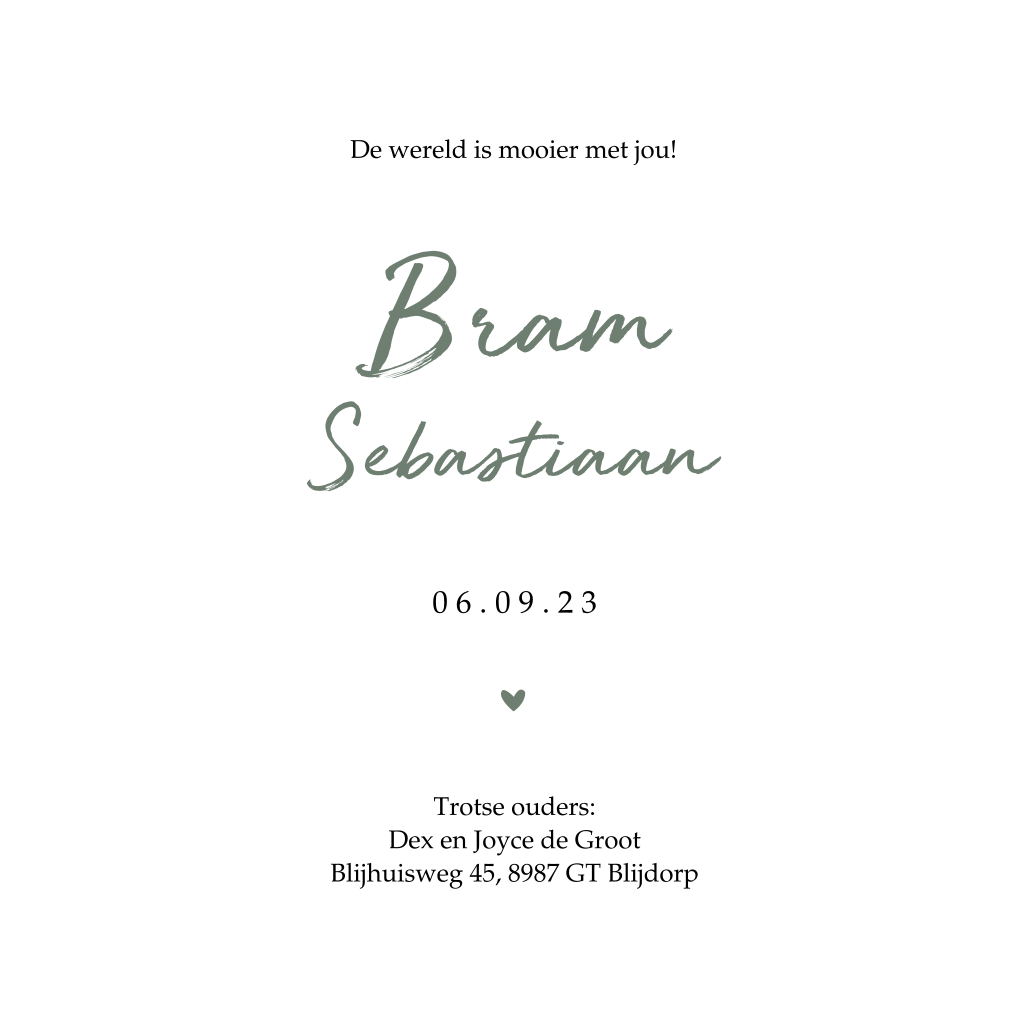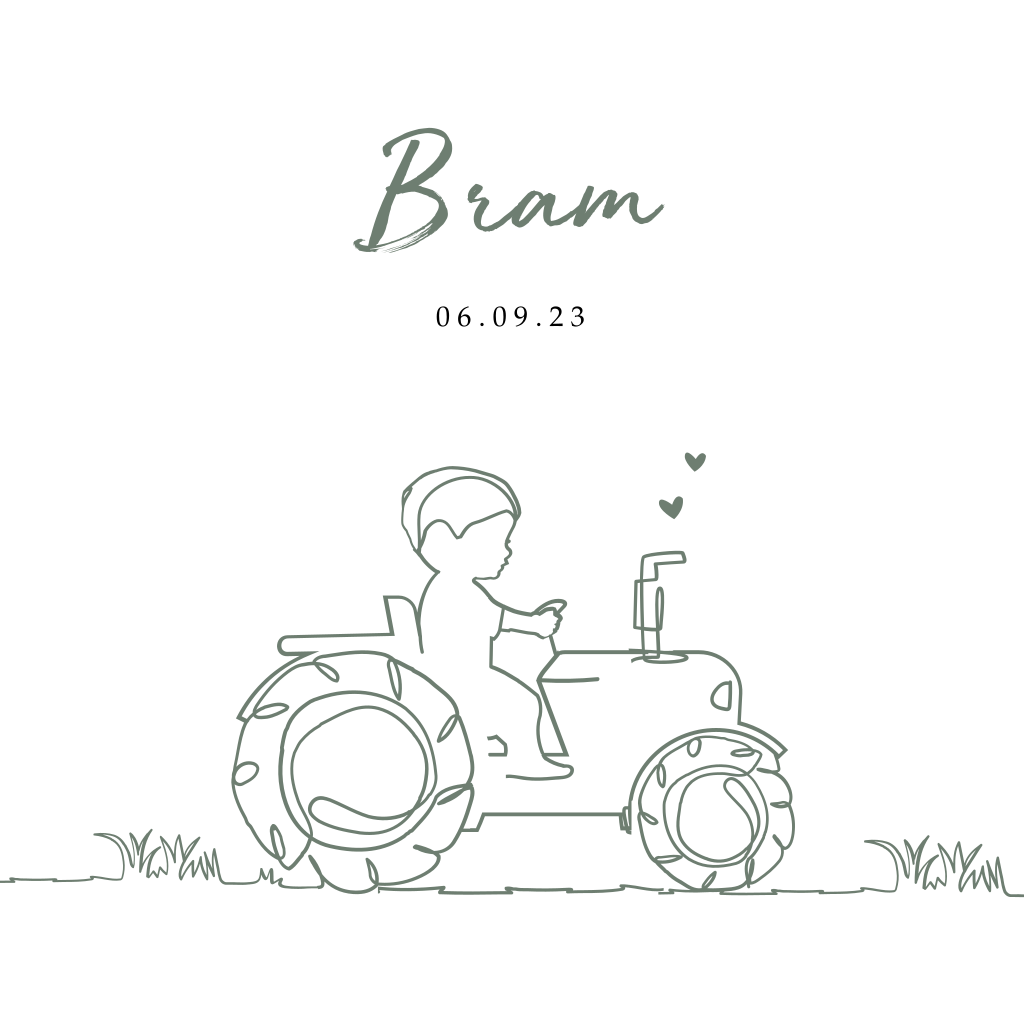 Hippe geboortekaart voor je pasgeboren zoon met stoere getekende jongetje op traktor in groen. Verander de kleur van de lijntekening in de editor en maak zo een uniek geboortekaartje.