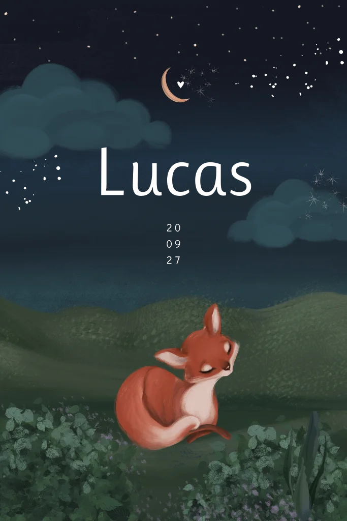 Een stijlvol geboortekaartje voor jouw zoon. Het staande kaartje heeft een prachtige illustratie van een vosje onder een donkere sterrenhemel. De naam wordt gedrukt in goudfolie. Pas het ontwerp naar wens aan in onze online editor.