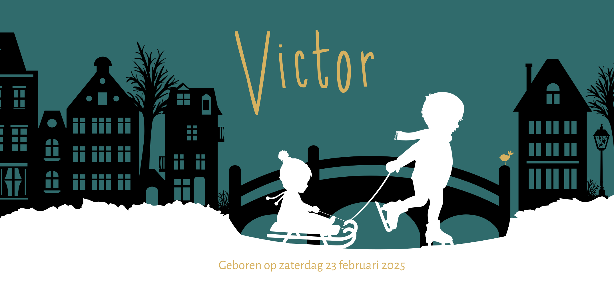 Hip geboortekaartje in winterthema met silhouet van grote broer op de schaatsen en het baby broertje op de slee. De grachtenpandjes op de achtergrond maken dit geboortekaartje helemaal af!