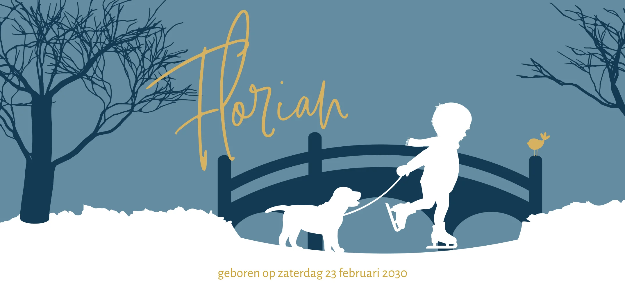 Winter geboortekaartje voor je pasgeboren zoon met een hip silhouet van een jongetje die met zijn hondje aan het schaatsen is.