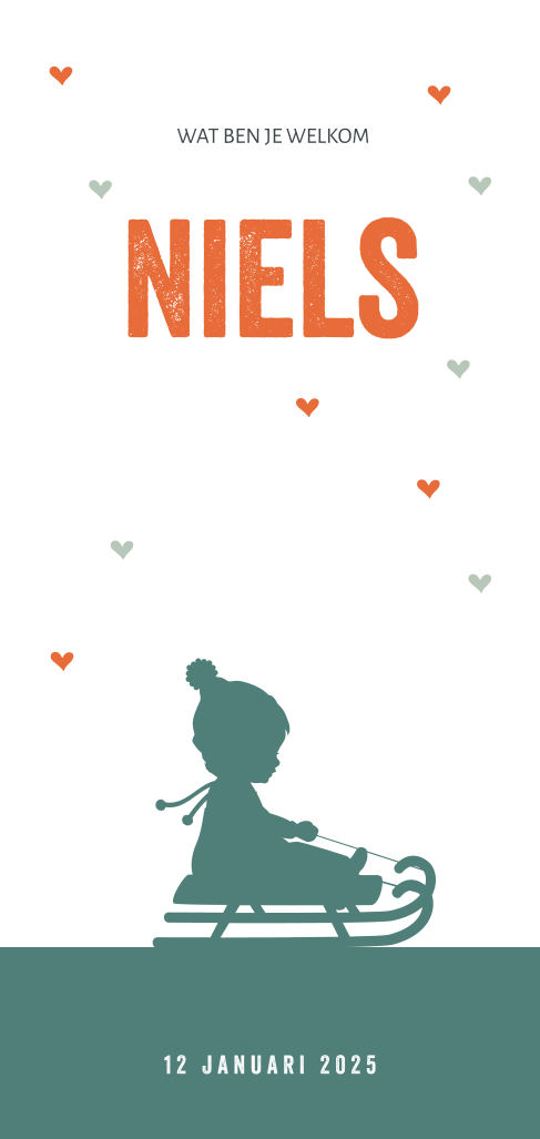 Lief winter geboortekaartje voor je pasgeboren zoon met een hip silhouet van een jongen op de slee. De romantische hartjes maken dit echt een schattig geboortekaartje!