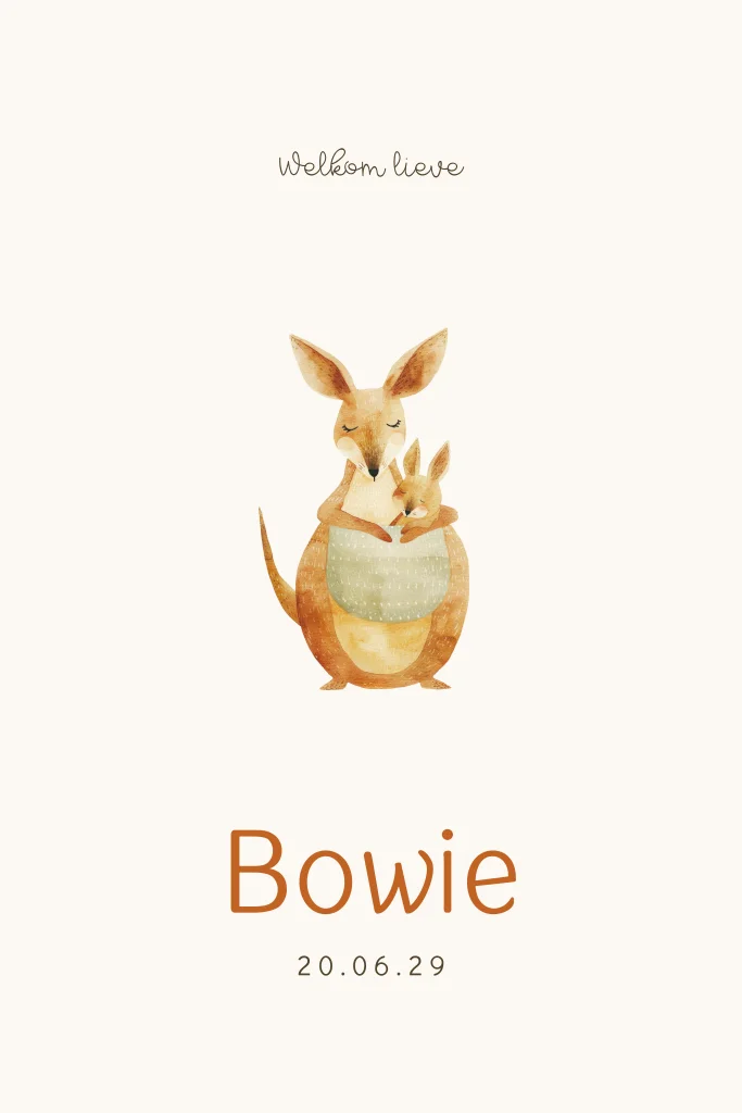 Lief geboortekaartje voor jullie kindje. Op het kaartje staat een moeder kangoeroe met haar kleintje. Het kaartje heeft verschillende bruintinten en is naar wens aan te passen in onze online editor.