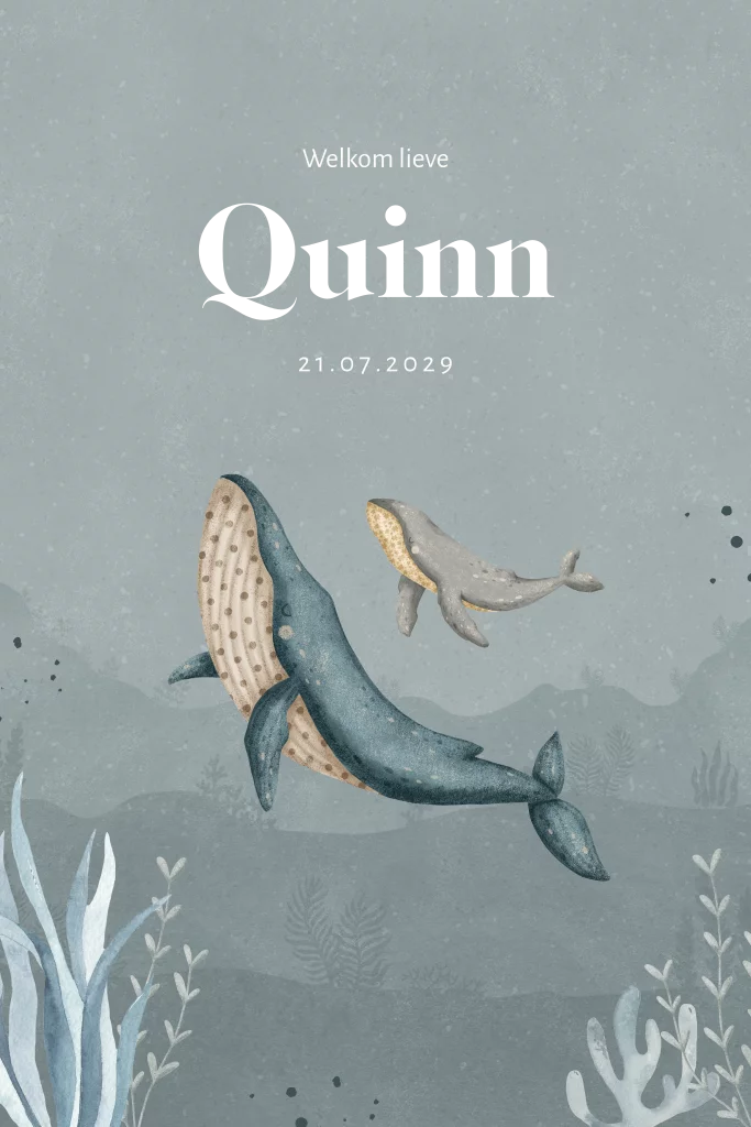 Stoer geboortekaartje voor jullie zoontje. Op het kaartje staat twee walvissen die zwemmen door de zee. Het kaartje heeft verschillende blauwtinten en de naam staat in goudfolie gedrukt. Het kaartje is naar wens aan te passen in onze online editor.